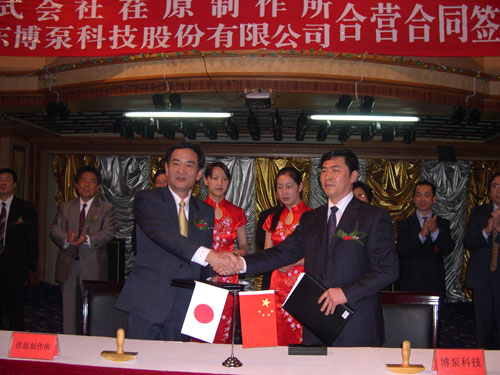 新聞中心 2005年4月27日,在博山萬杰國際大酒店山東博泵科技股份有限公司與日本株式會社荏原制作所正式簽署了注冊資本1100萬美元的合營公司――荏原博泵有限責任公司。該公司的建立將通過引進世界最大的泵企業――日本株式會社荏原制作所的先進技術,加快大型泵、高壓泵國產化進程,建成具有國際競爭力的一流企業。為中國水電、核電及超臨界火電項目,為南水北調等大型水力工程提供高質量、高技術含量的一流泵產品,提升中國機械工業技術、質量水平,促進產品更新換代,為中國電力、冶金、水力事業的發展乃至中國國民經濟的發展做出應有的貢獻。